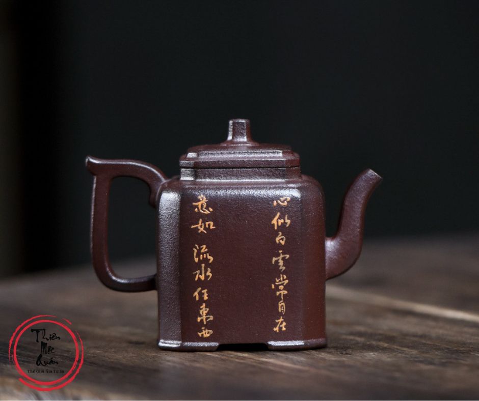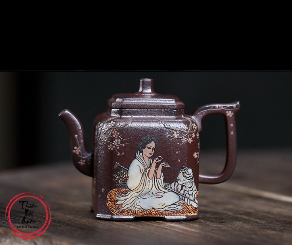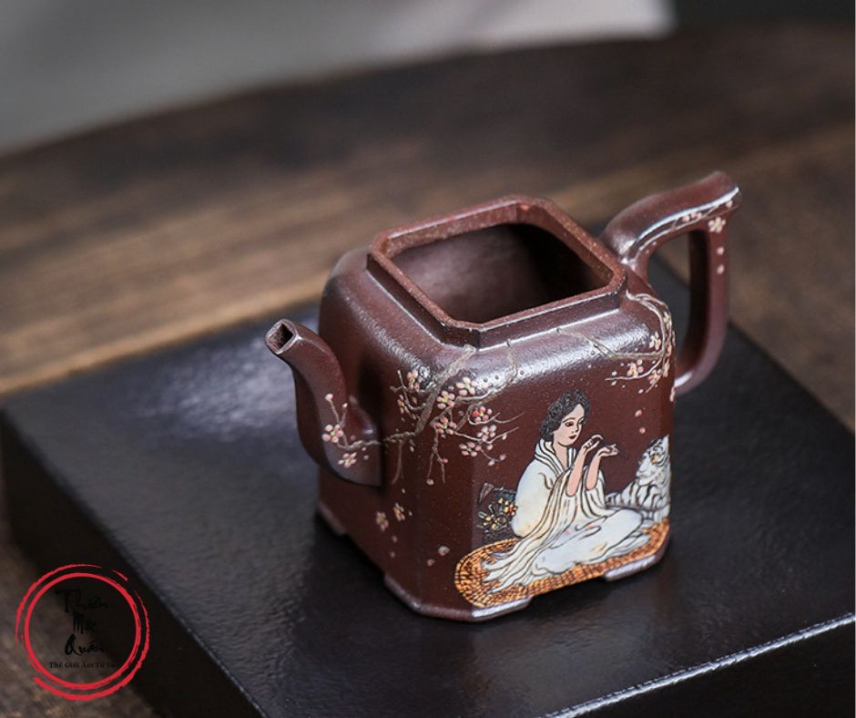 Ấm tử sa Tứ Phương Sướng Xuân được chế tác thủ công từ tử sa Kim Sa, dung tích khoảng 150ml, phù hợp sử dụng trong trà đạo. Dáng ấm vuông cổ điển, kết cấu chắc tay, giữ nhiệt tốt. Điểm nhấn là họa tiết mỹ nhân và linh thú vẽ tay tinh xảo, mang giá trị nghệ thuật và sưu tầm cao. Sản phẩm do tác giả Chu Phượng Muội thực hiện, đóng gói hộp gấm sang trọng, thích hợp thưởng trà hoặc làm quà biếu cao cấp.