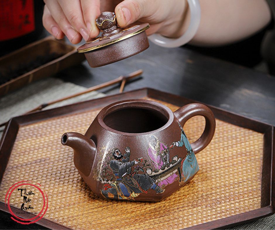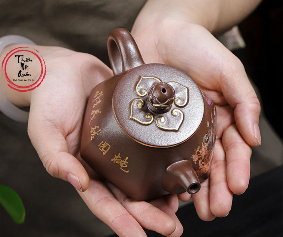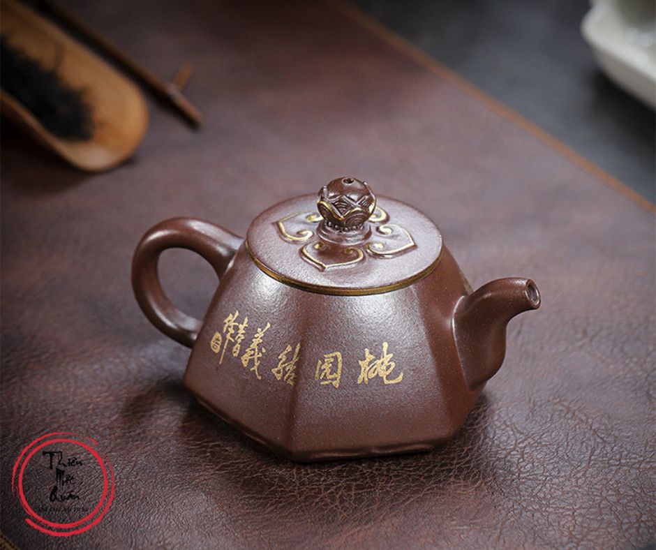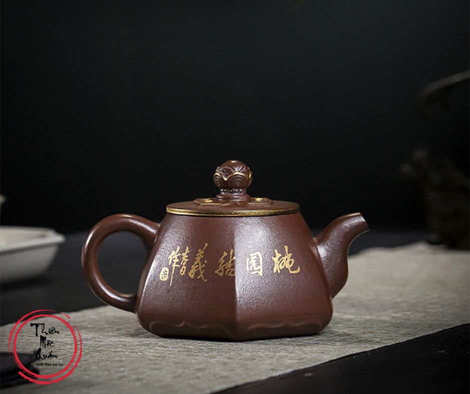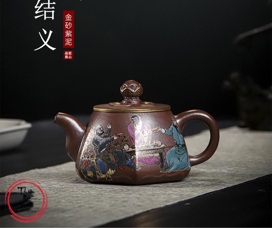 Ấm tử sa Đào Viên Kết Nghĩa được chế tác thủ công từ tử sa Kim Sa, dung tích 200ml, phù hợp pha trà đạo hằng ngày. Dáng ấm tròn thấp, cân đối, giữ nhiệt tốt, giúp trà lên hương rõ và vị ổn định. Họa tiết tích truyện Đào Viên Kết Nghĩa vẽ tay sinh động, mang ý nghĩa tình nghĩa – trung tín. Sản phẩm do tác giả Thẩm Vệ thực hiện, đóng gói hộp gấm trang trọng, thích hợp sưu tầm hoặc làm quà biếu.