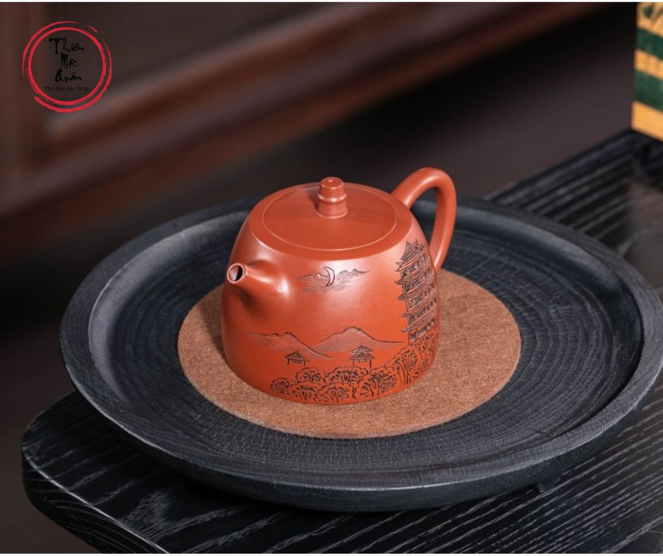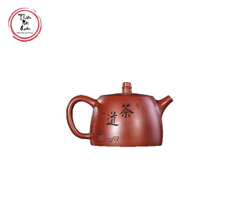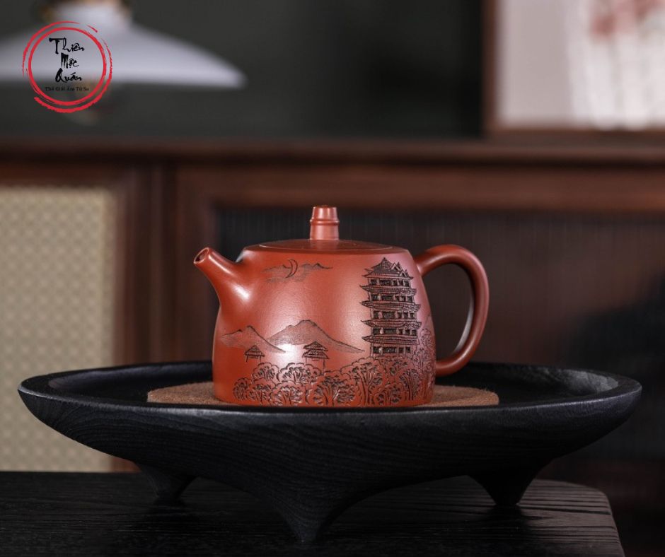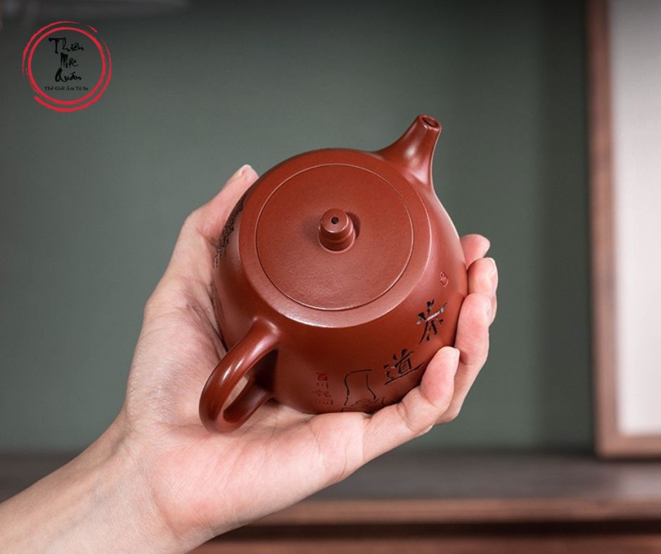 Ấm tử sa dáng Hán Đạc cổ điển, thân thấp cân đối, đường nét mạnh mẽ mang phong cách truyền thống. Chất đất Đại Hồng Bào nguyên khoáng giúp giữ nhiệt tốt, tôn hương trà, thích hợp pha các dòng trà ô long, phổ nhĩ, hồng trà. Họa tiết chạm khắc tinh tế tạo điểm nhấn nghệ thuật, phù hợp chơi trà, sưu tầm hoặc làm quà biếu cao cấp.