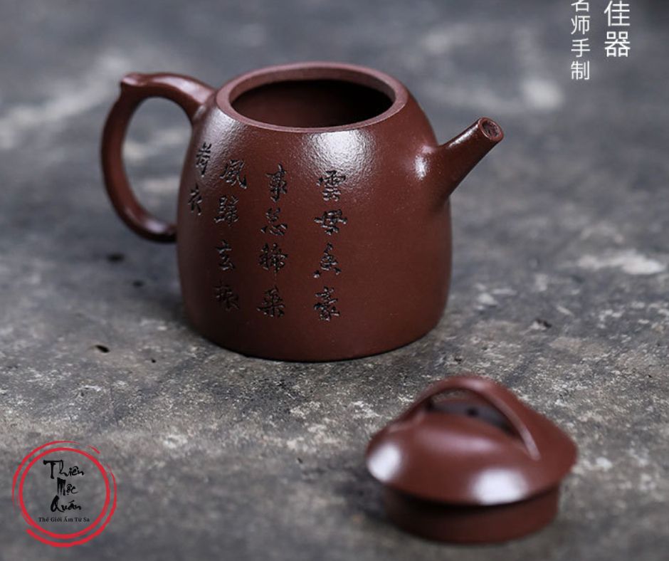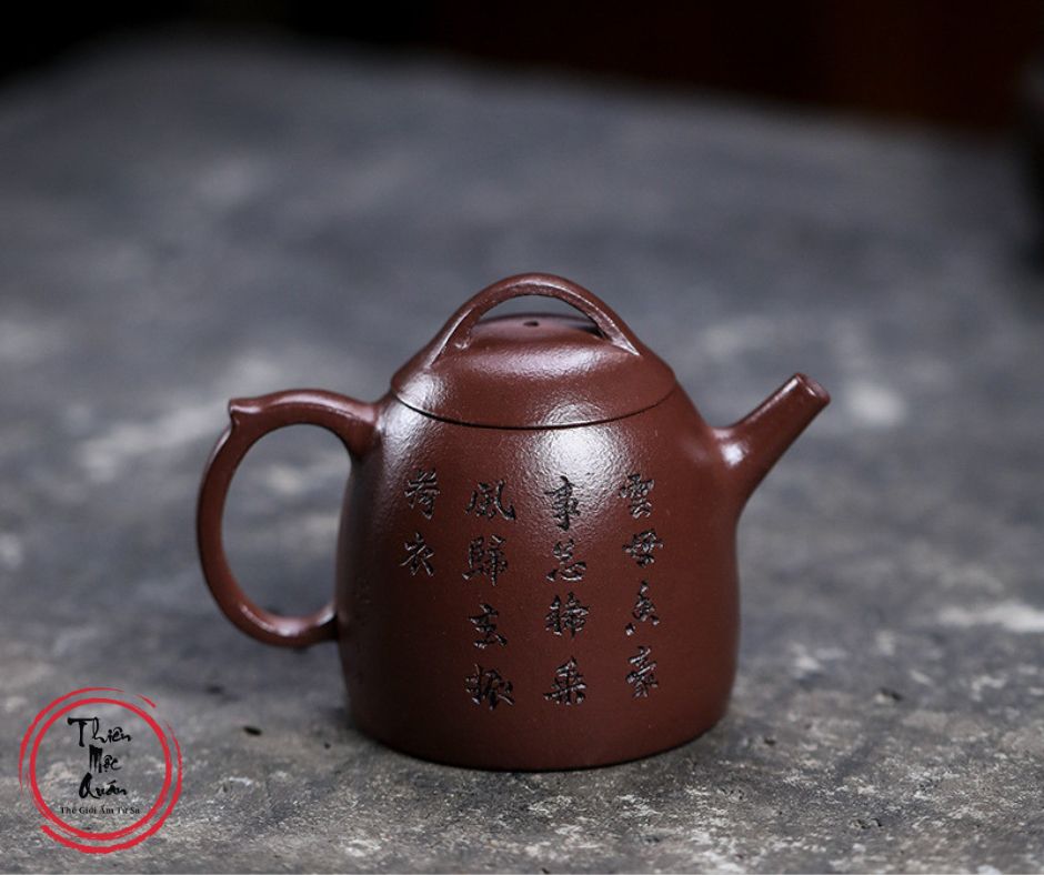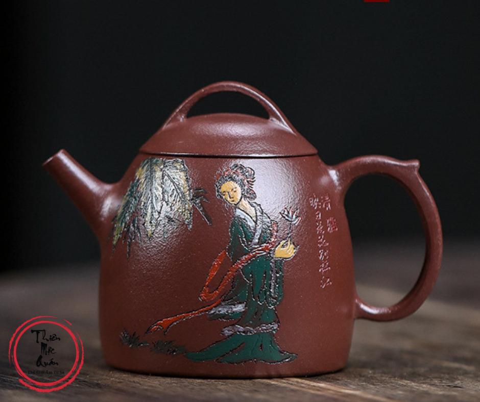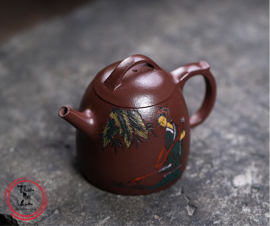 Ấm tử sa Tần Quyền được chế tác thủ công từ đất tử sa, dung tích khoảng 145ml, phù hợp pha trà công phu. Dáng ấm cổ điển, thân tròn chắc, giữ nhiệt tốt, giúp trà lên hương rõ và vị ổn định. Họa tiết nhân vật vẽ tay mang phong vị thư họa truyền thống. Sản phẩm do tác giả Thẩm Vệ thực hiện, đóng gói hộp gấm trang nhã, thích hợp thưởng trà hoặc làm quà biếu tinh tế.