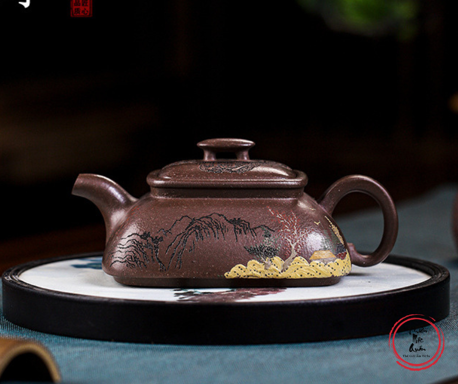 - Một tác phẩm mang hơi thở của núi sông hùng vĩ, được chế tác bởi Nghệ nhân Mỹ thuật Công nghiệp Quốc gia Chu Phượng Mai. Điểm đặc biệt của chiếc ấm này chính là kỹ thuật đắp vẽ thủ công tạo nên một bức tranh phong cảnh có chiều sâu và sống động ngay trên thân ấm.