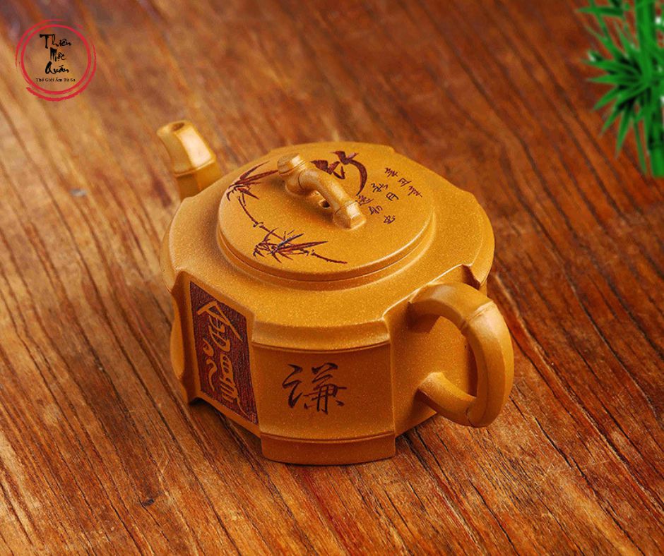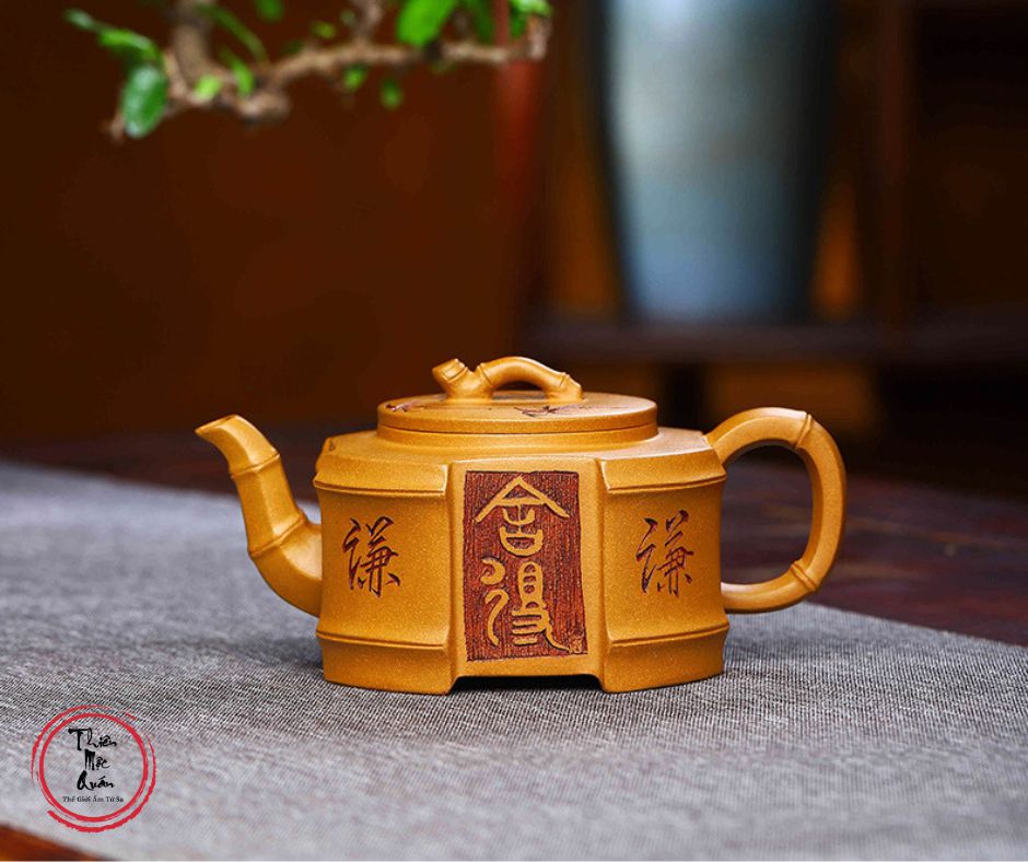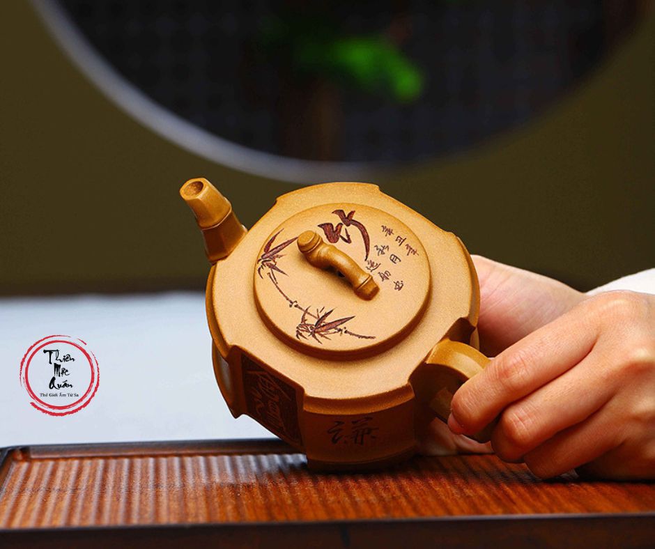 - Thân ấm được khắc chữ và họa tiết mang phong cách cổ điển, tạo nên vẻ đẹp sang trọng nhưng vẫn mộc mạc.