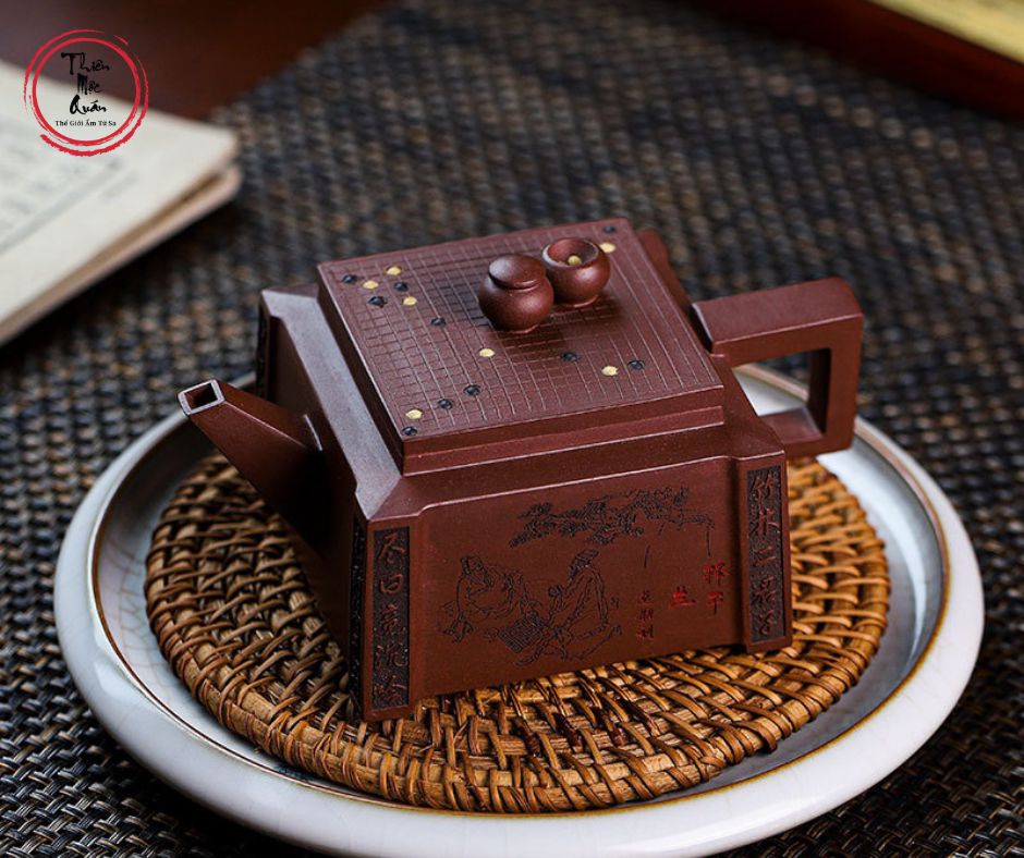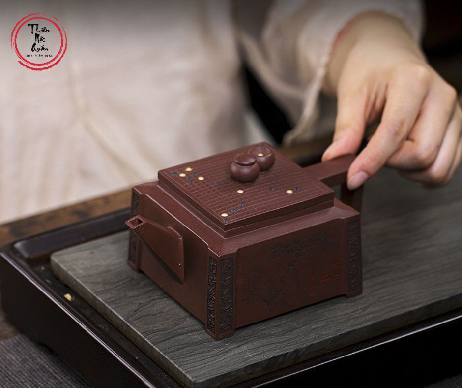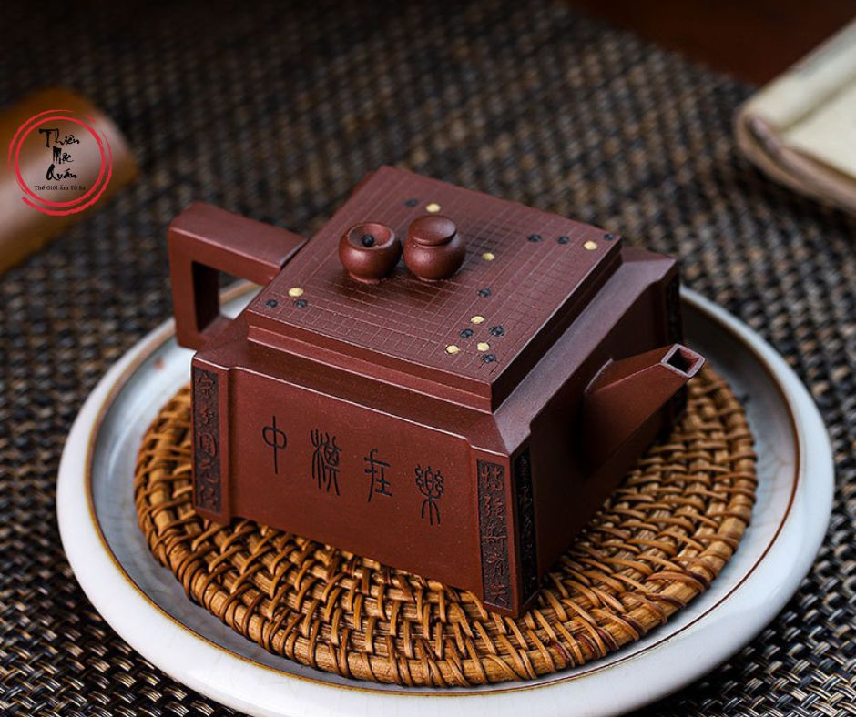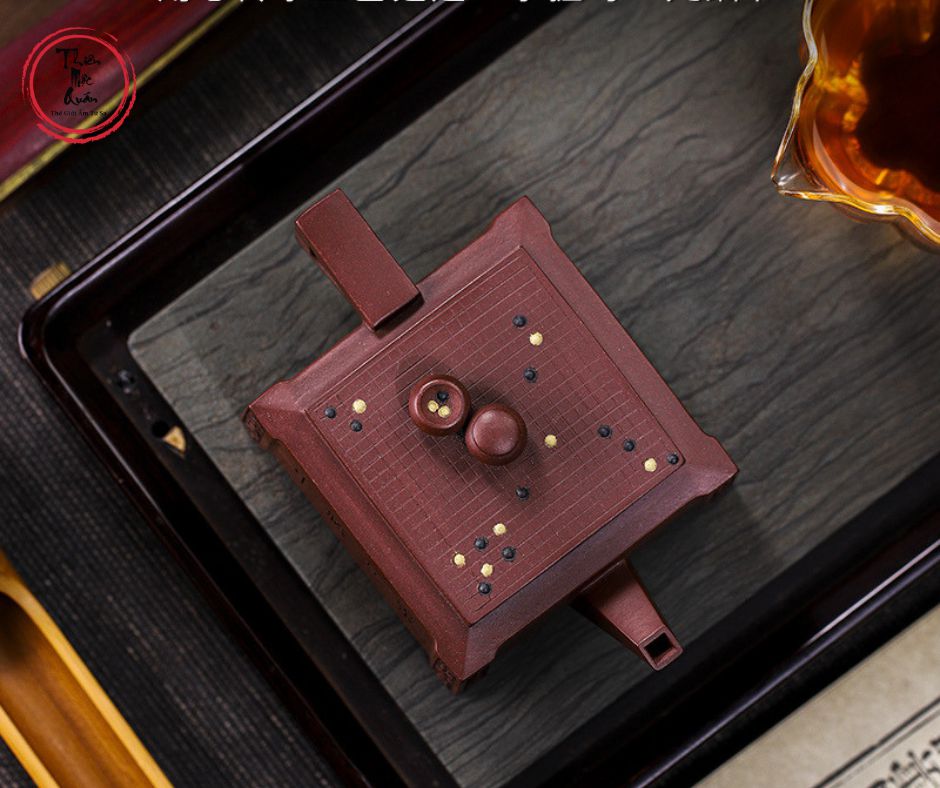 - Kiểu dáng độc bản: Dáng ấm vuông vững chãi, tượng trưng cho sự chính trực và điềm tĩnh. Nắp ấm được thiết kế như một bàn cờ vây với các quân cờ nhỏ làm núm cầm, mang lại ý nghĩa triết lý sâu sắc về sự tĩnh tại và trí tuệ.