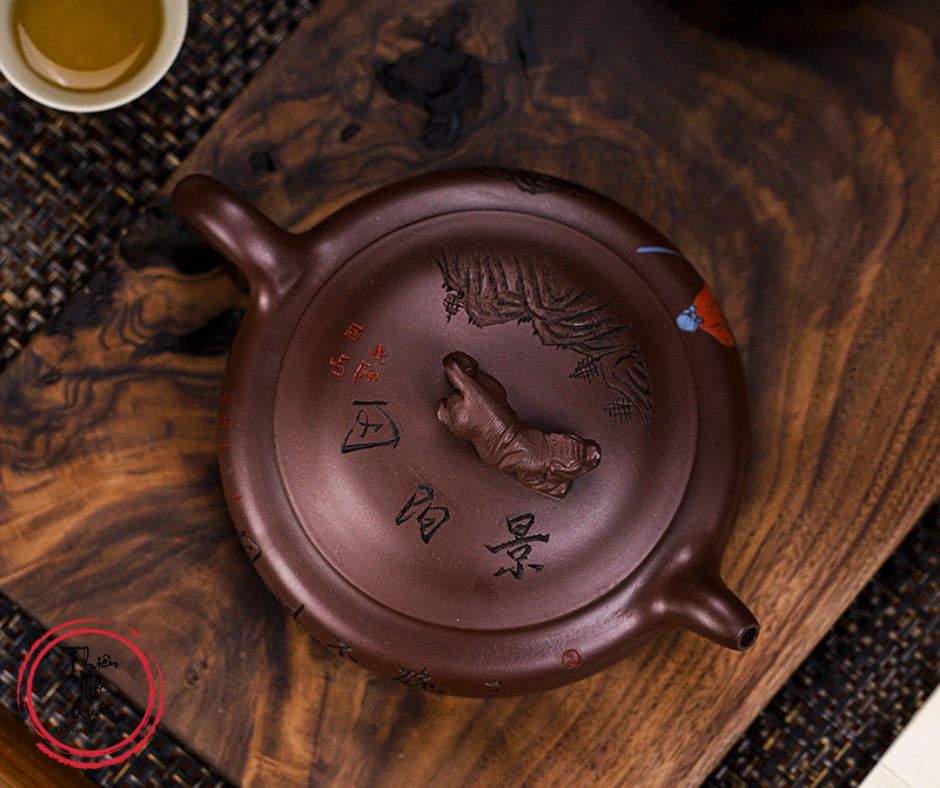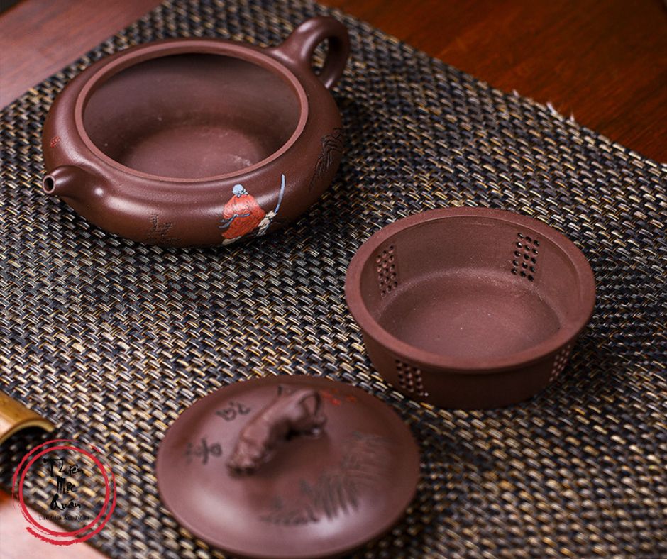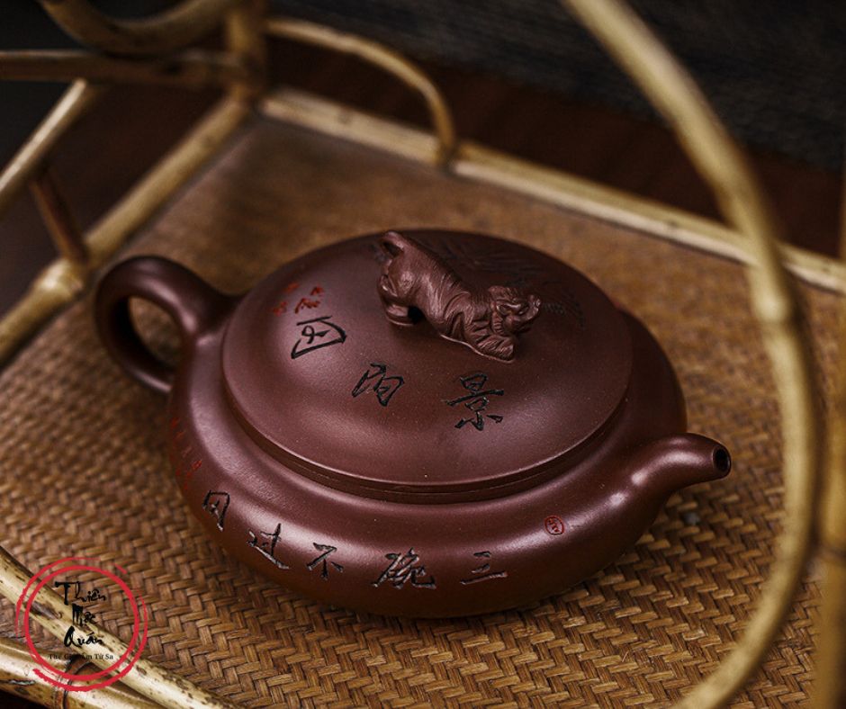- Ấm có dáng thấp, thân dẹt tròn, vai ấm nở đều, tạo cảm giác vững chãi và hài hòa. Miệng ấm rộng giúp dễ cho trà, dễ vệ sinh. Vòi ấm ngắn, to, dòng nước mạnh và gọn. Quai cầm tròn đầy, cân đối với thân ấm, cầm chắc tay, không nóng. Nắp ấm khít, trên nắp tạo hình hổ nằm đây là điểm nhấn nghệ thuật và phong thủy, biểu trưng cho sức mạnh và uy quyền.