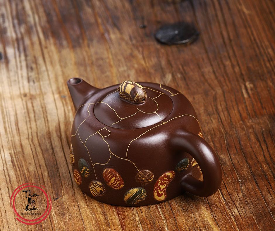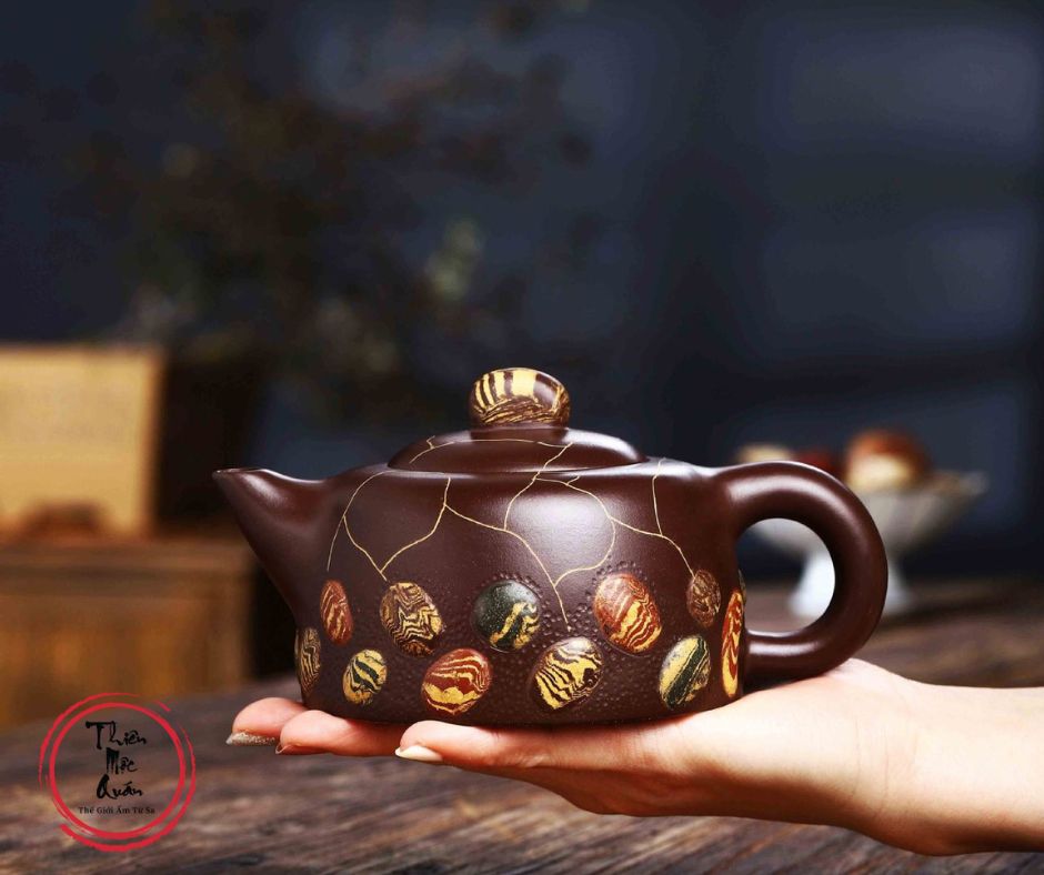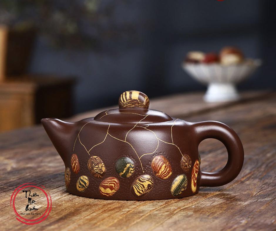 Cảm hứng hoa văn lấy từ đá mưa Vũ Hoa (雨花石) loại đá nổi tiếng của Nam Kinh, Trung Quốc. Các họa tiết vân đá trên thân ấm phân bố tự nhiên, mỗi chiếc đều khác nhau, không trùng lặp, tạo nên vẻ đẹp độc bản, sinh động nhưng vẫn trang nhã, trầm ổn đúng tinh thần trà đạo.