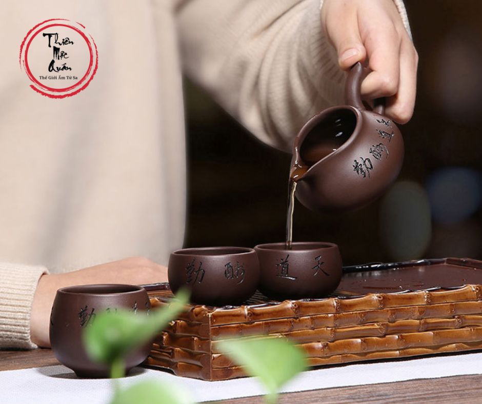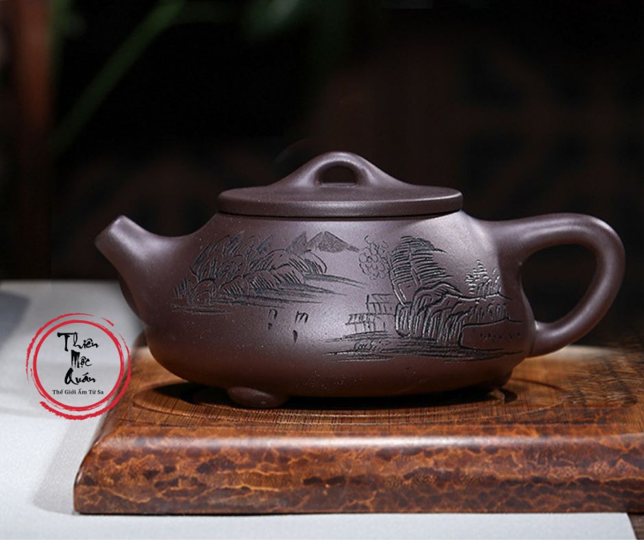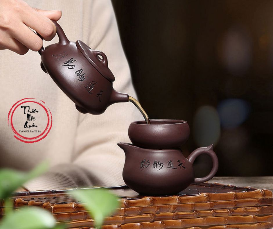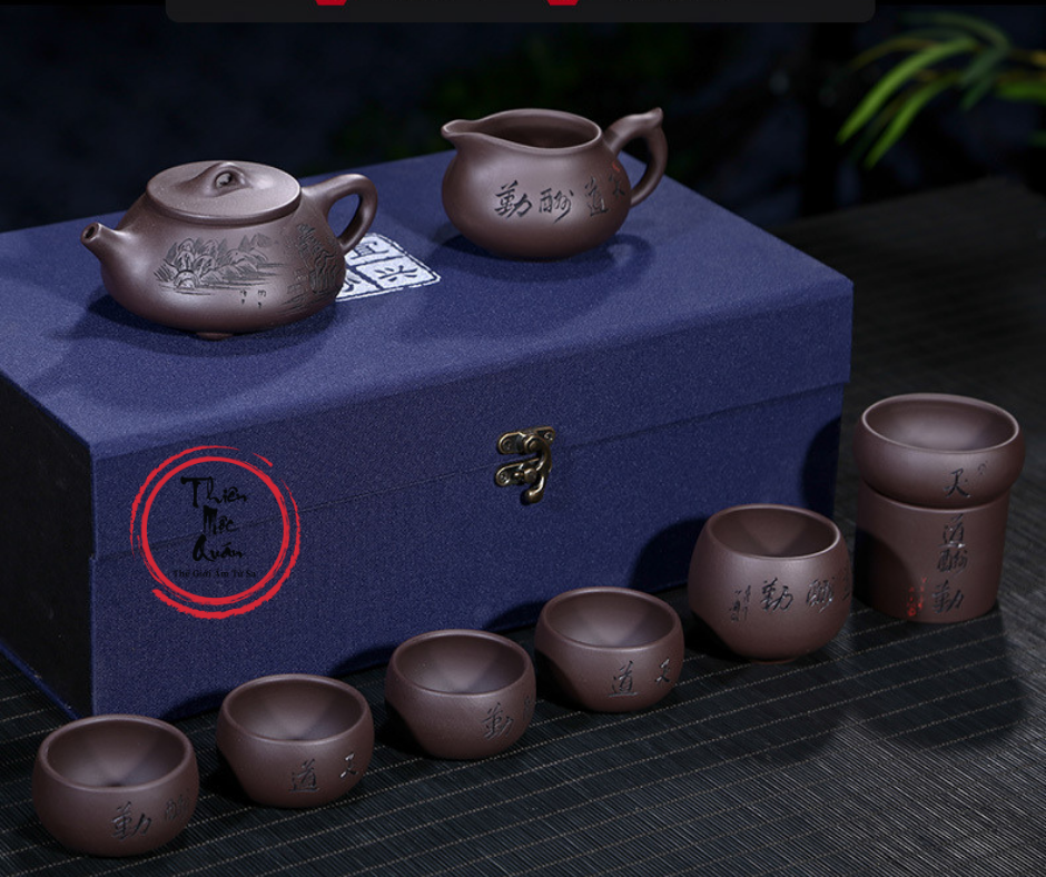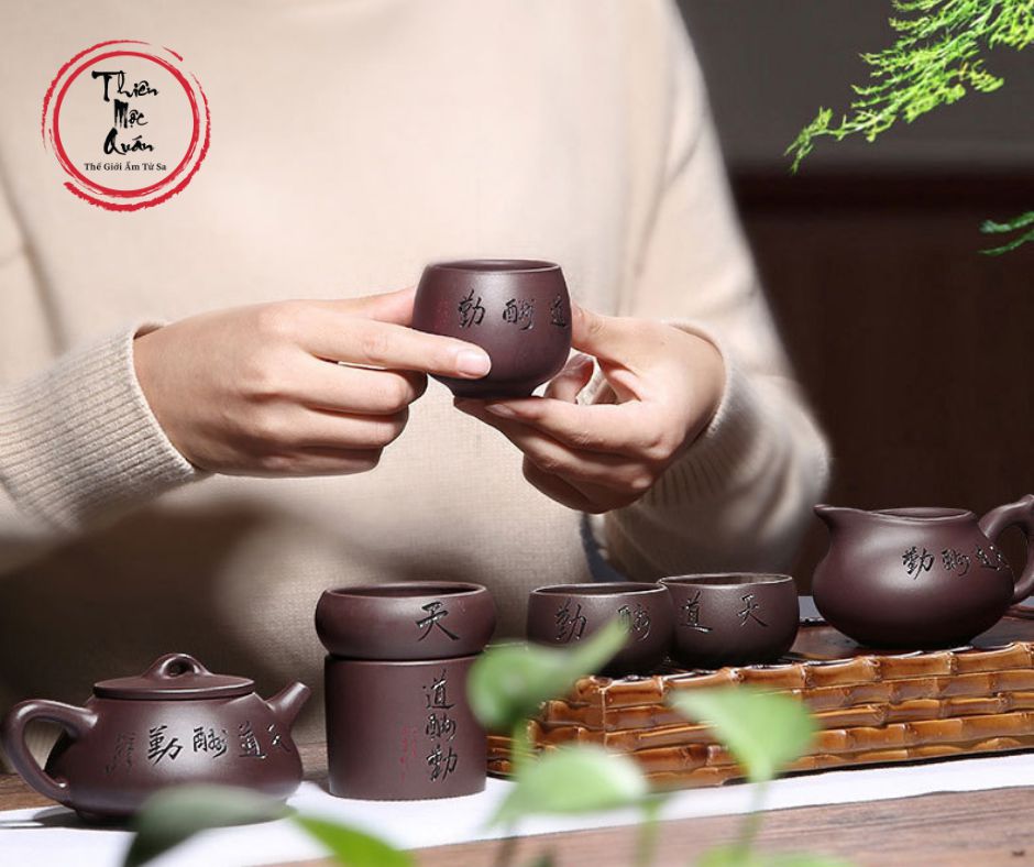 - Chủ đề thiết kế: Thiên Đạo Thù Cần – Mang ý nghĩa "Đạo trời đền đáp người cần cù", kết hợp cùng họa tiết sơn thủy hữu tình được khắc tinh xảo trên thân ấm.