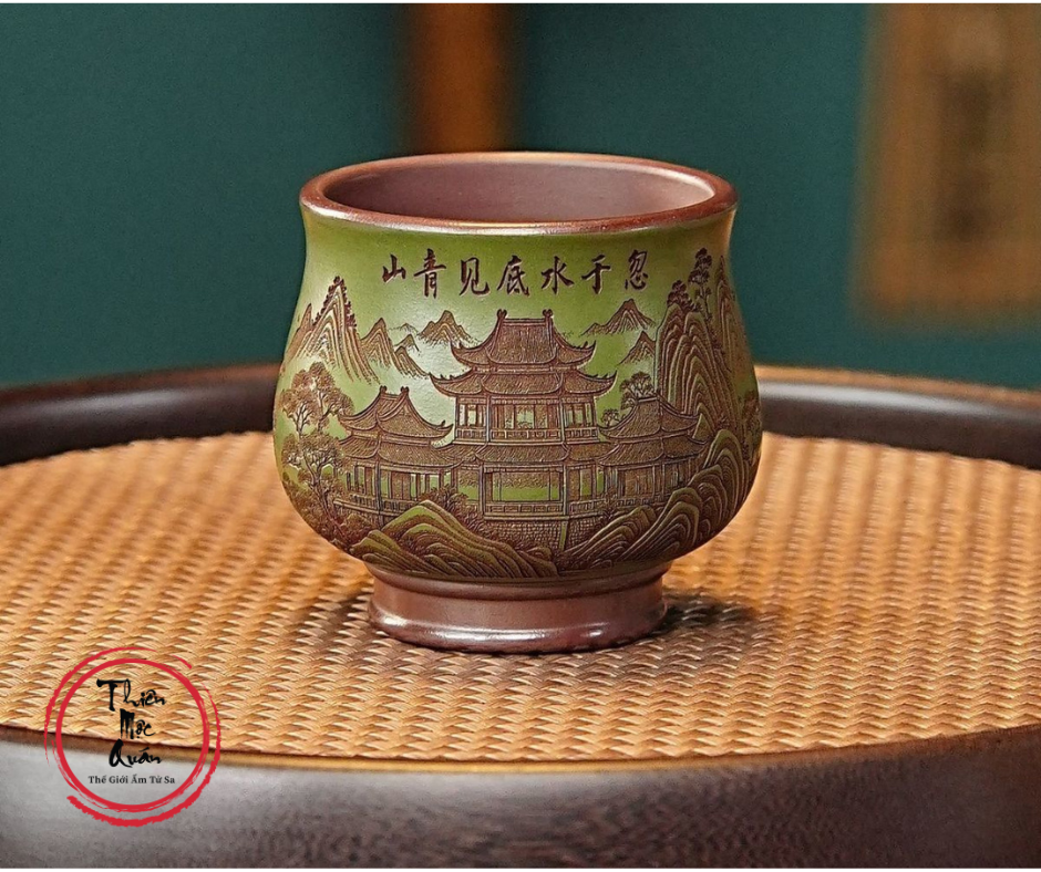 - Họa tiết: Khắc họa thủ công phong cảnh Sơn Thủy Lâu Các (Núi non, sông nước và lầu đình). Đường nét khắc phóng khoáng, mang đậm hơi thở nghệ thuật thư pháp và hội họa truyền thống.