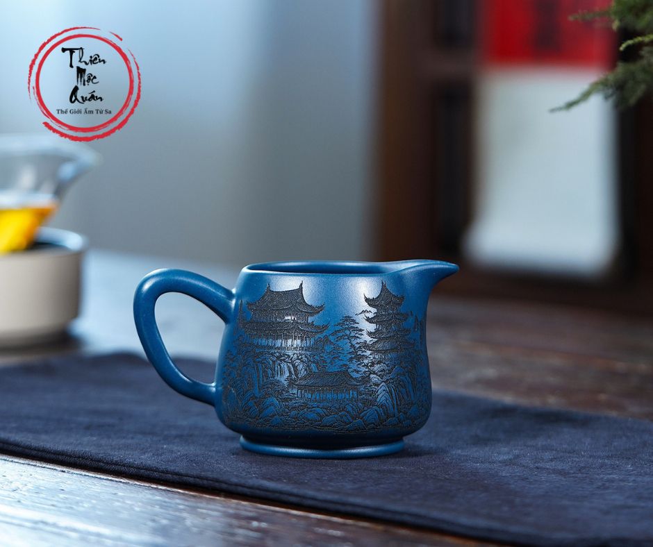 Tống tử sa thủ công cao cấp với gam xanh Thiên Thanh Nê hiếm, tạo cảm giác dịu mát, trang nhã, trầm tĩnh. Thân tống khắc họa sơn thủy xuân sắc tinh tế, mang ý nghĩa an nhiên, thư thái rất được người chơi trà yêu thích.